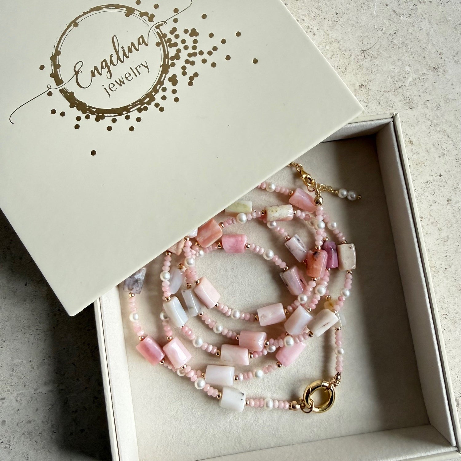 Lange ketting van roze opaal en zoetwaterparels - ROZALITA