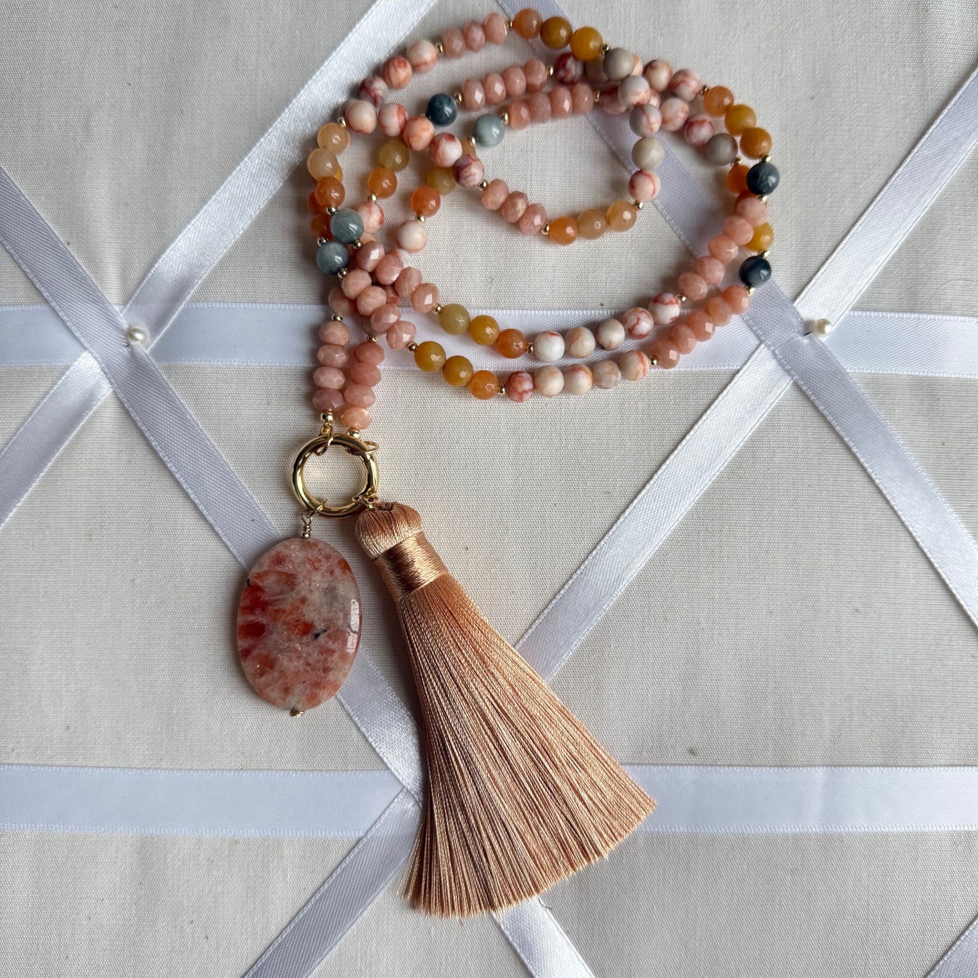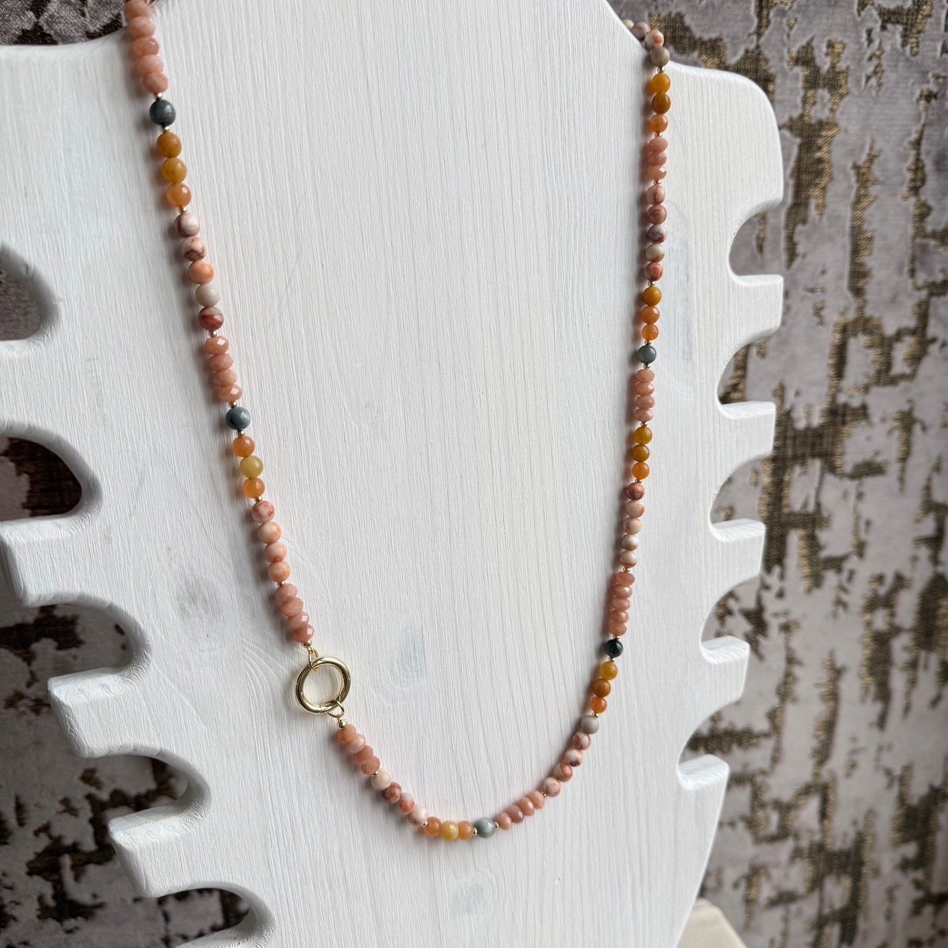 Lange ketting geregen op gecoat draad van verschillende kralen, zoals zonnesteen rondellen, eagle eye en maansteen.
