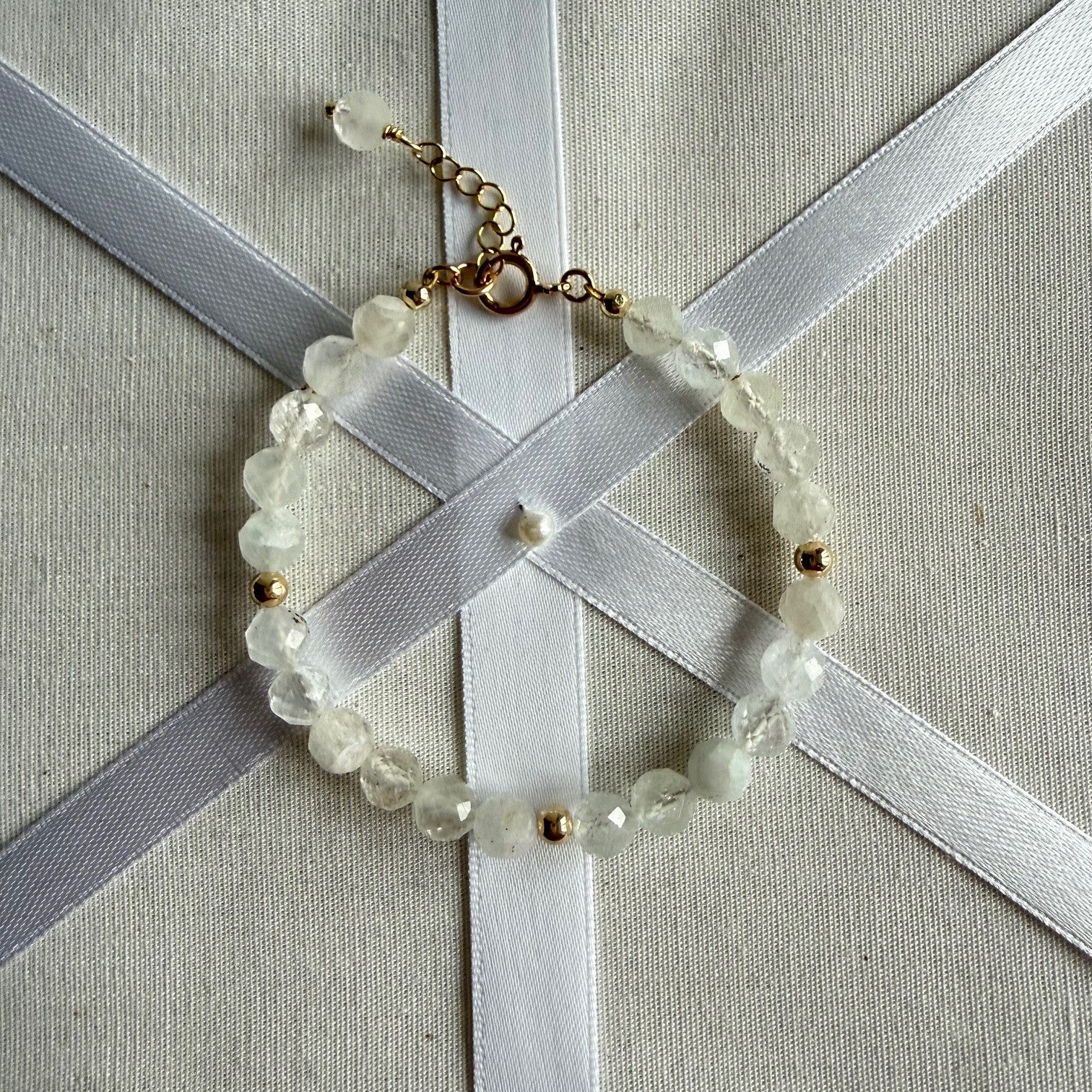 De armband is geregen op gecoat draad en sluit met een 14/20 gold filled veerslot en heeft een klein verlengkettinkje