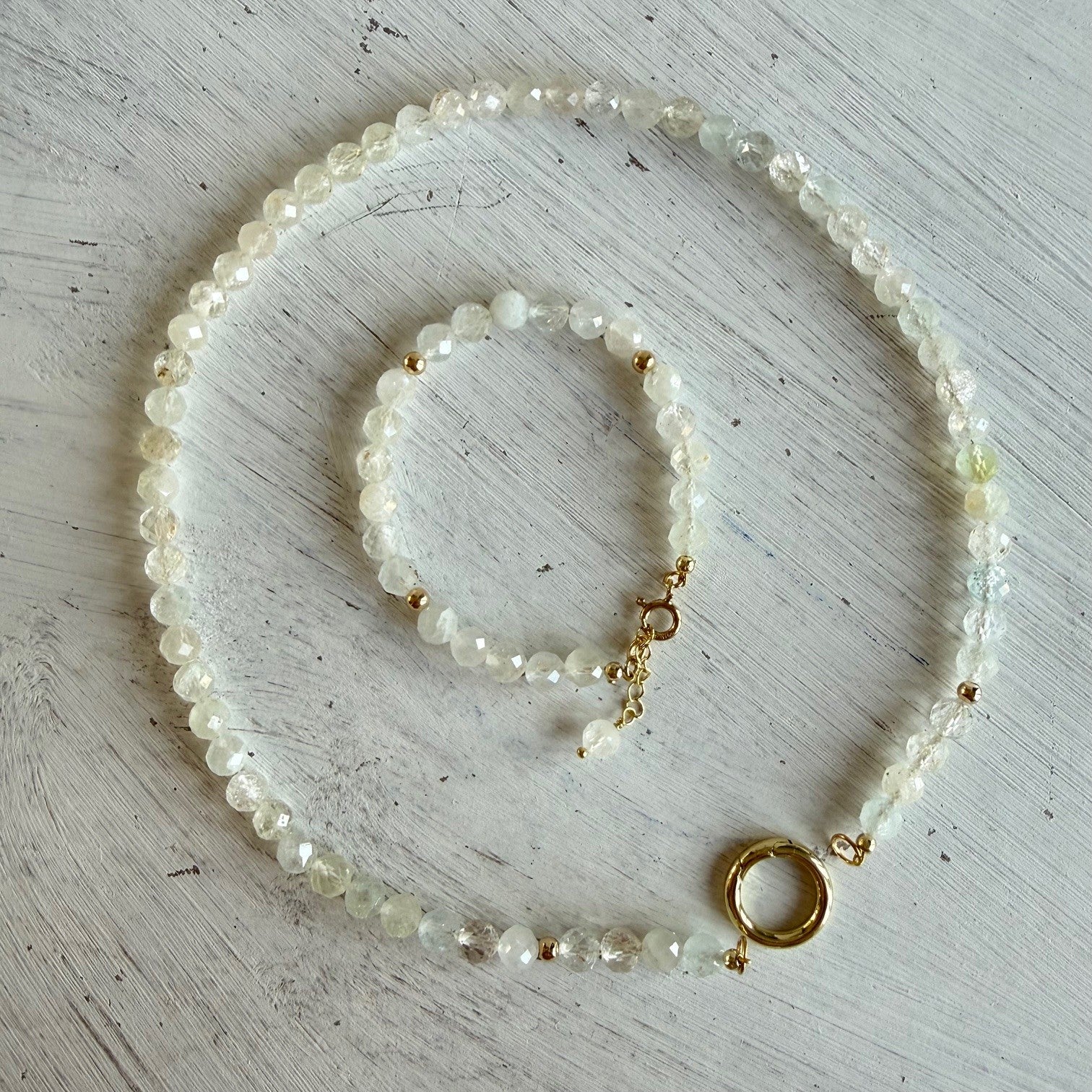 Armbandje geregen van witte topaas 8 mm facetkralen. De kralen zijn wit, soms iets blauw of iets geel. Sommige kralen zijn transparant, andere zijn meer wolkachtig wit.