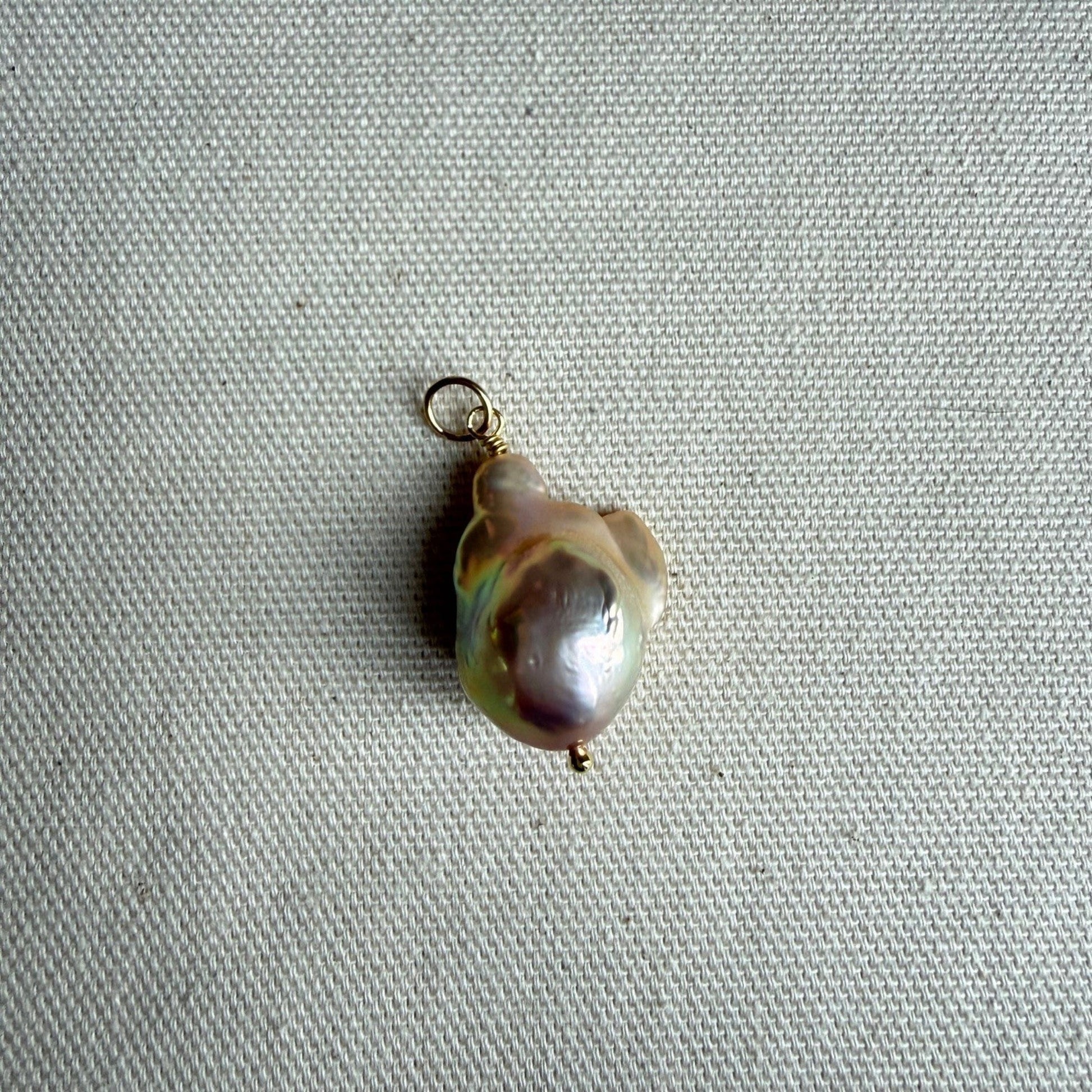 Grote baroque zoetwaterparel met prachtige gouden glans aan gold filled ringetje voor aan sluiting of kettinkje.