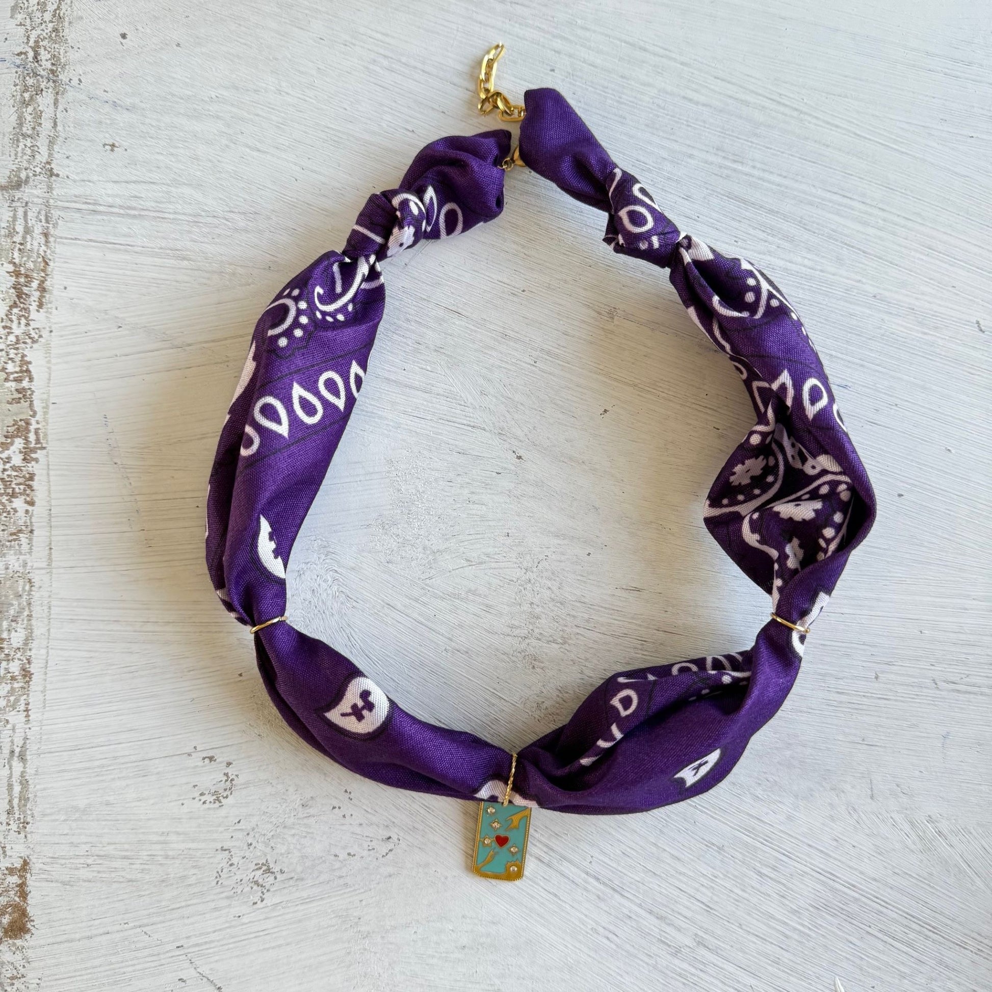Bohemian bandana ketting gemaakt in een paarse kleur met een stainless steel sluiting met verlengkettinkje.