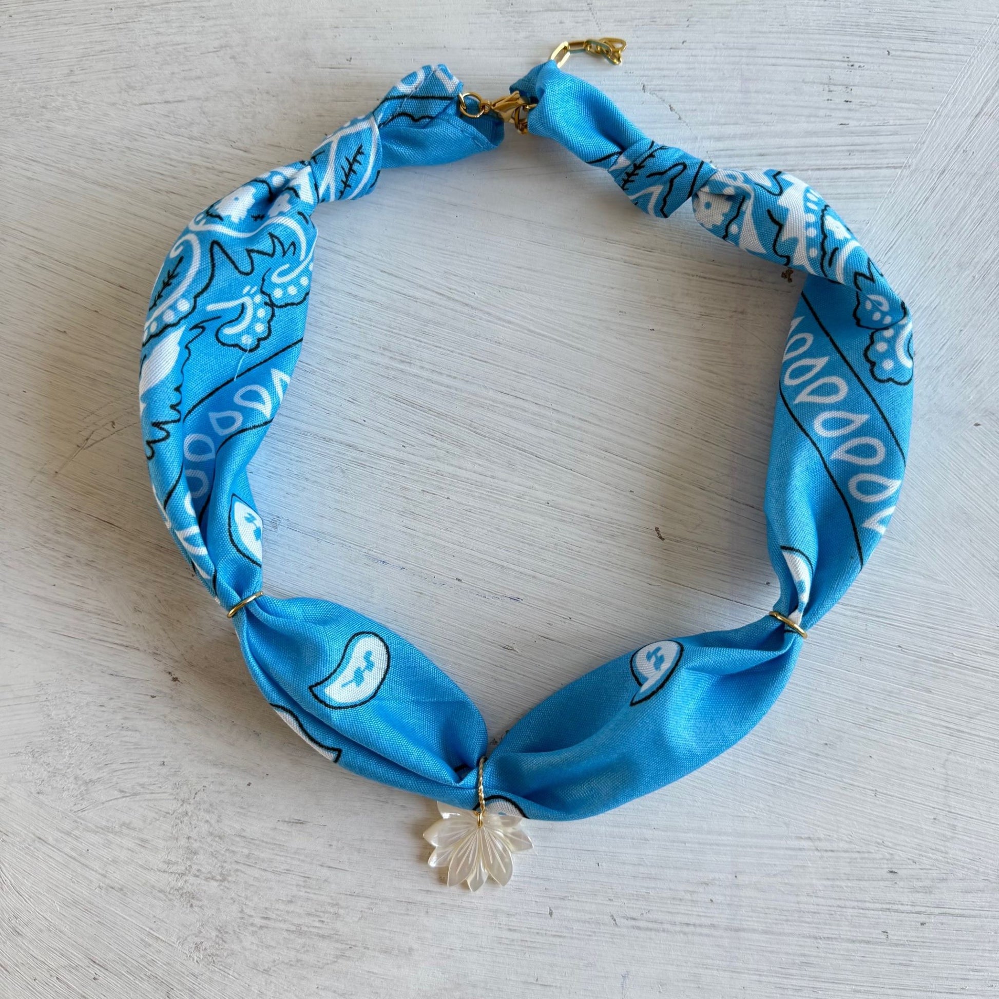 Bohemian bandana ketting gemaakt in een mooie kleur blauw met een stainless steel sluiting met verlengkettinkje.