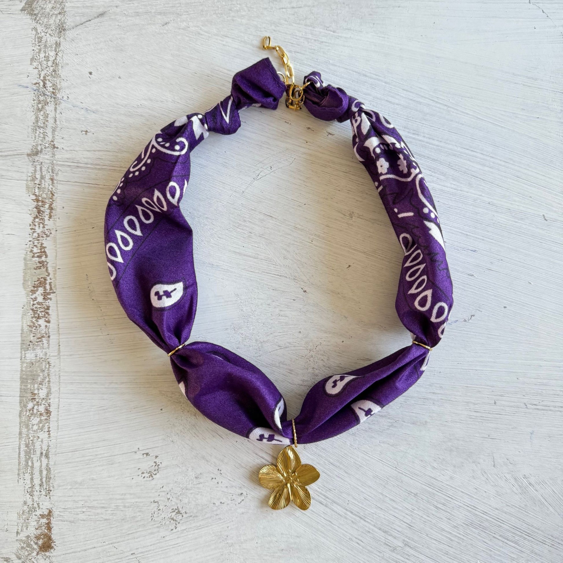 Bohemian bandana ketting gemaakt in een mooie paarse kleur met een stainless steel sluiting met verlengkettinkje.