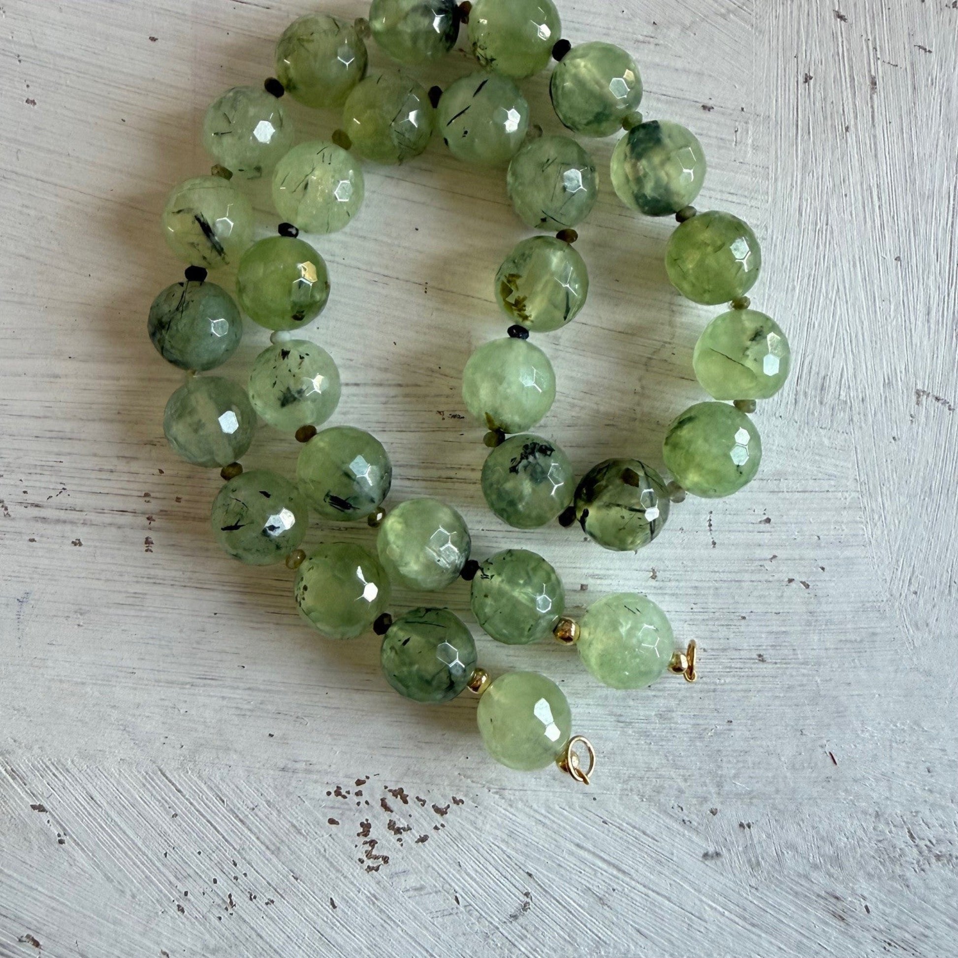 Ketting geregen van 14 mm prehniet facetkralen. De kralen zijn grijsgroen met donkergroene- tot bijna zwarte insluitsels van epidoot.