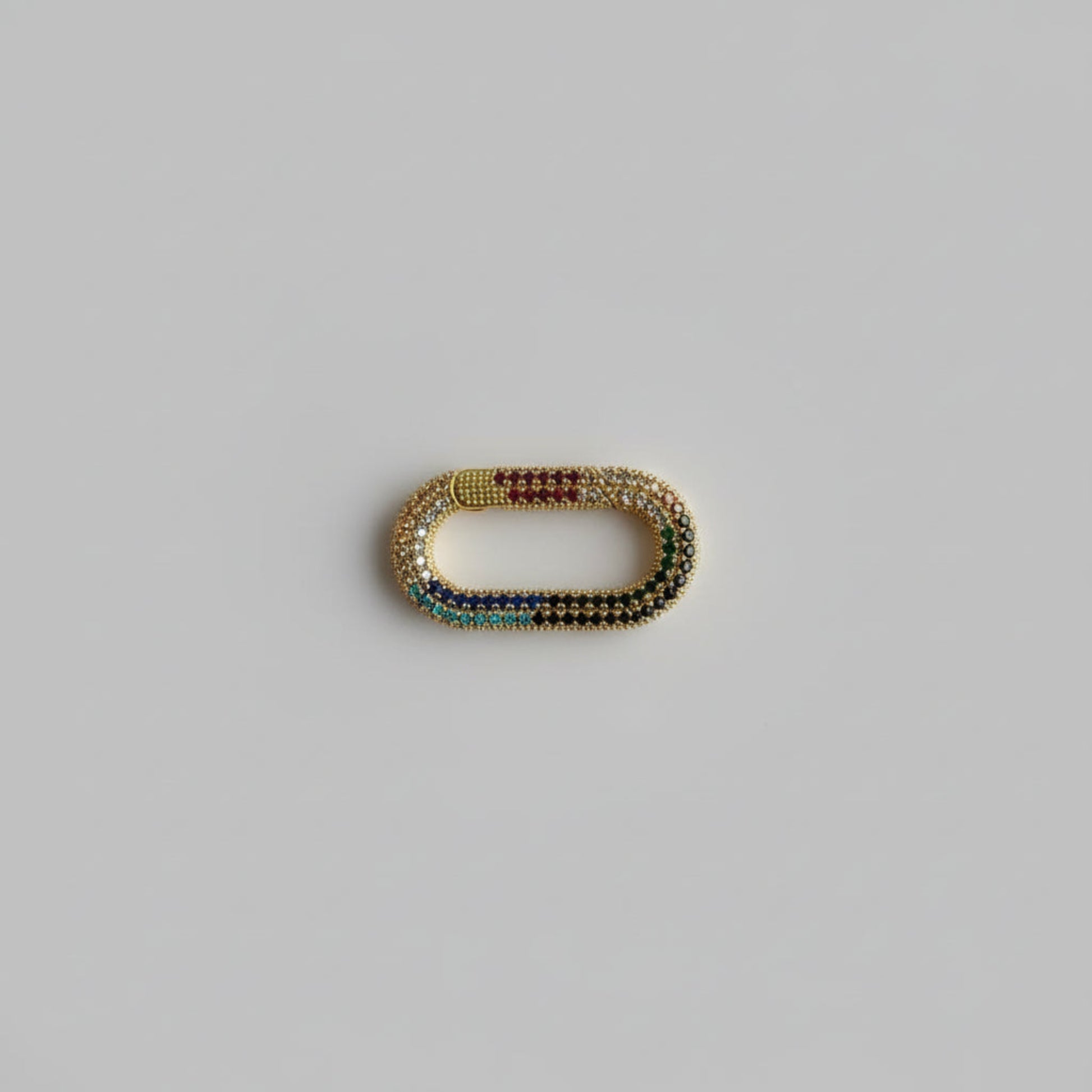 Grote gold filled sluiting met aan beide zijden kleine kleurige strass steentjes.