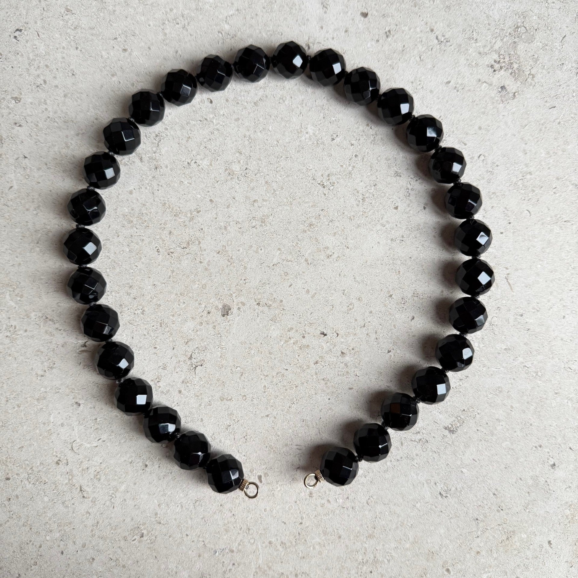 De ketting is geknoopt met antracietkleurig draad. De kralen zijn 14 mm onyx facetkralen.