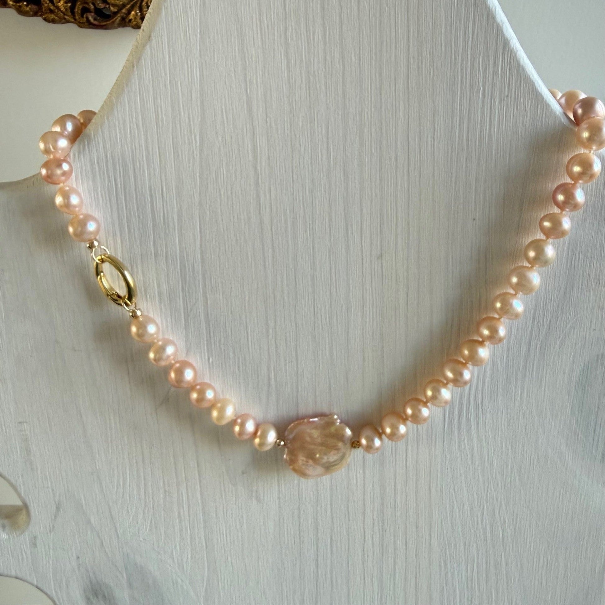 De parels zijn ongeveer 8 mm in doorsnede en hebben kleuren die gaan van goud naar heel lichtroze, ook hebben de parels verschillende vormen van rond naar rondel en puntvormig.