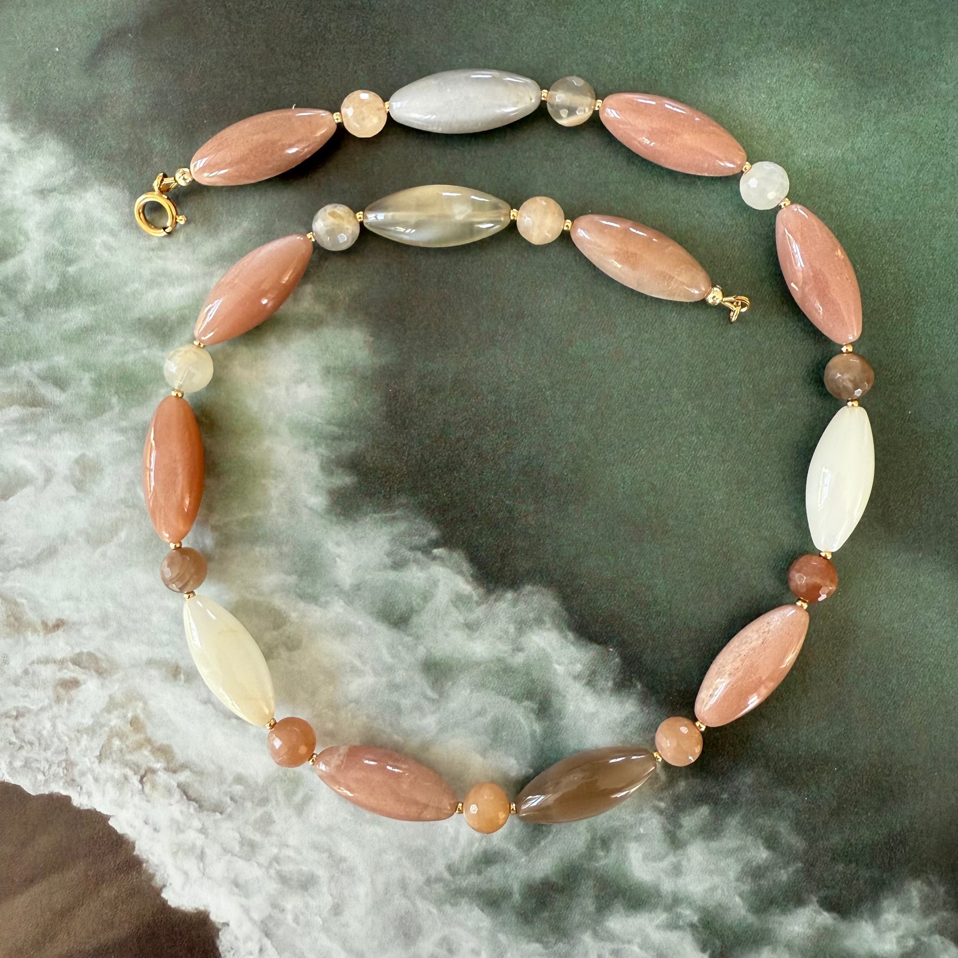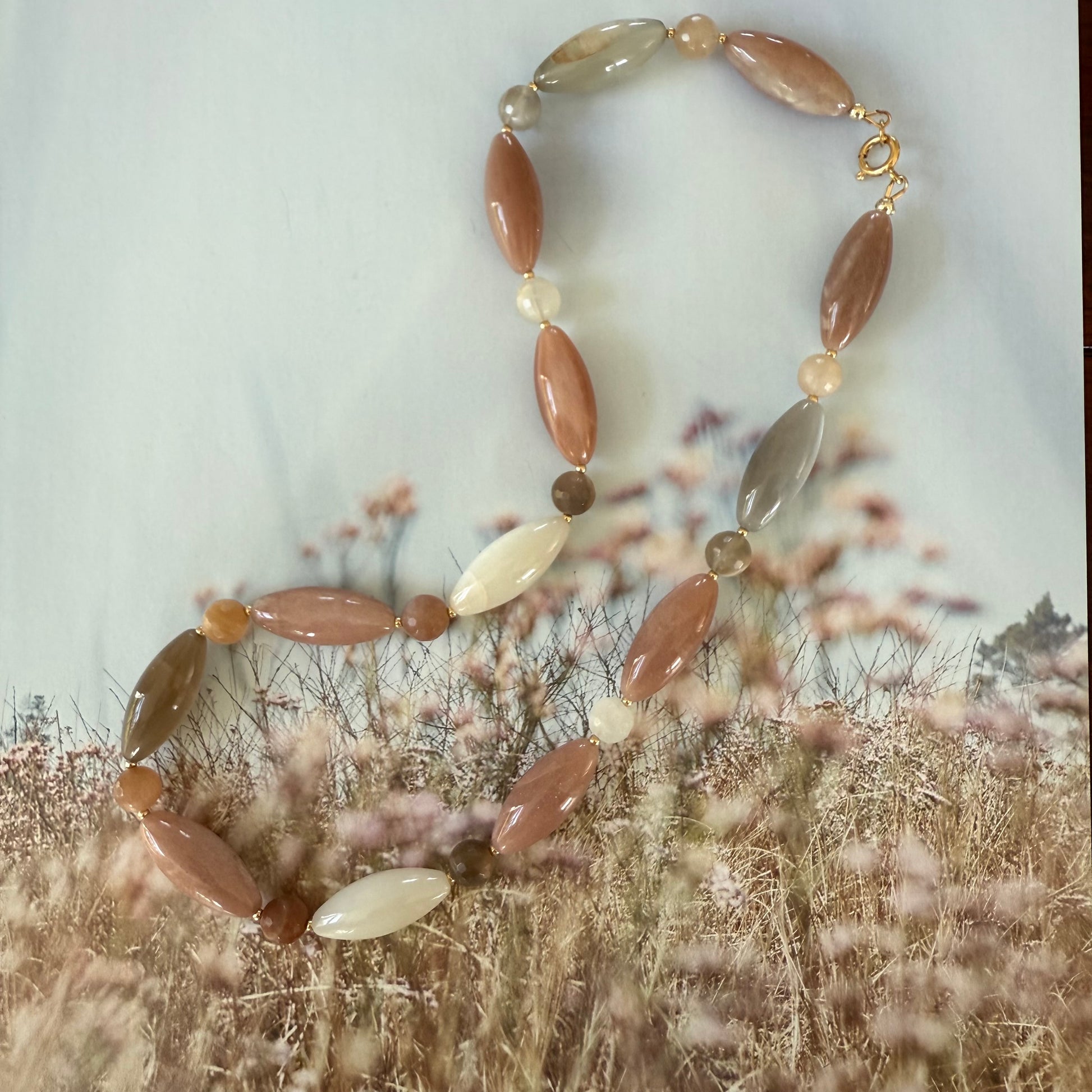 Ketting van olijfvormige maanstenen afgewisseld met ronde kralen in verschillende zachte tinten en kleine 14/20 gold kraaltjes. De ketting is geregen op gecoat draad en sluit met een 14/20 gold filled veerslot.