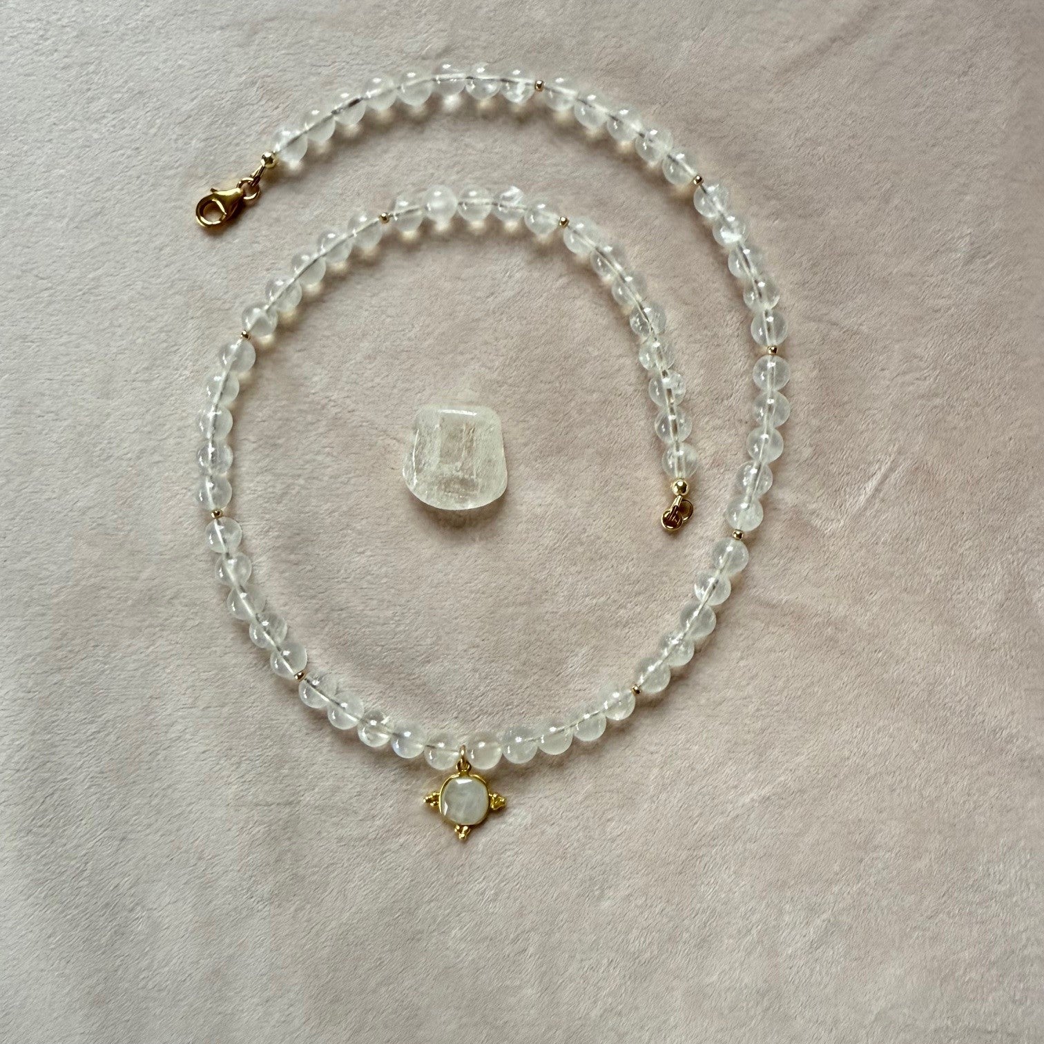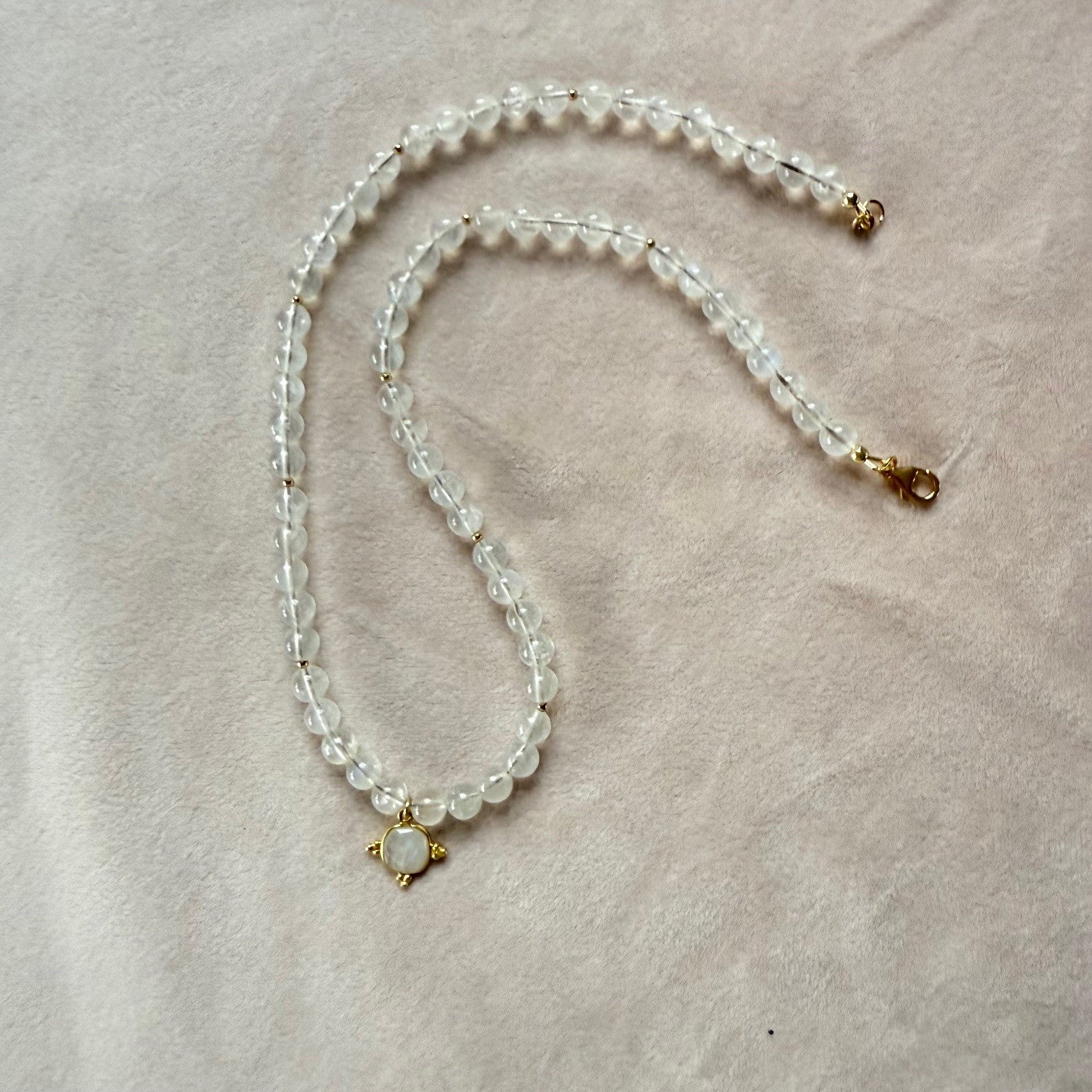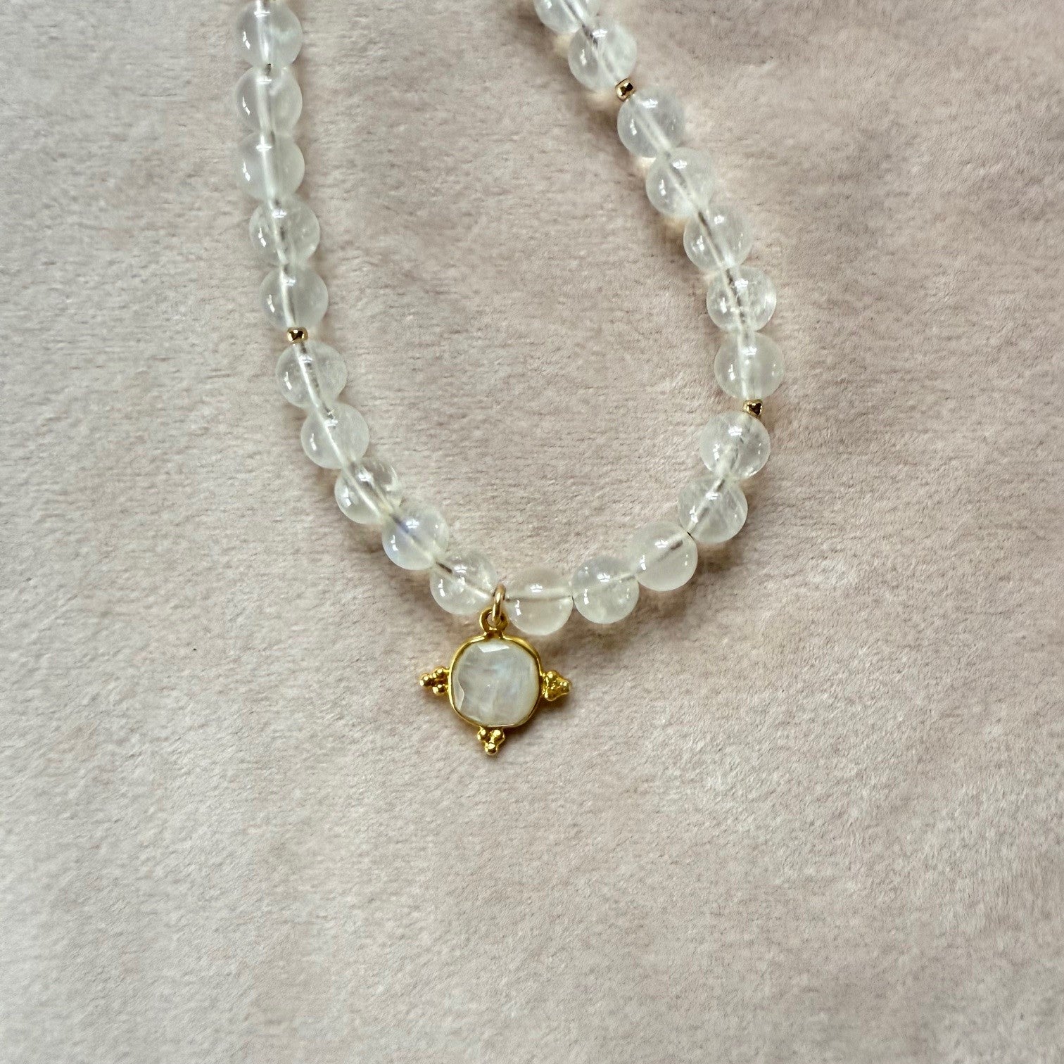 Aan de ketting hangt een bedel van regenboog maansteen.