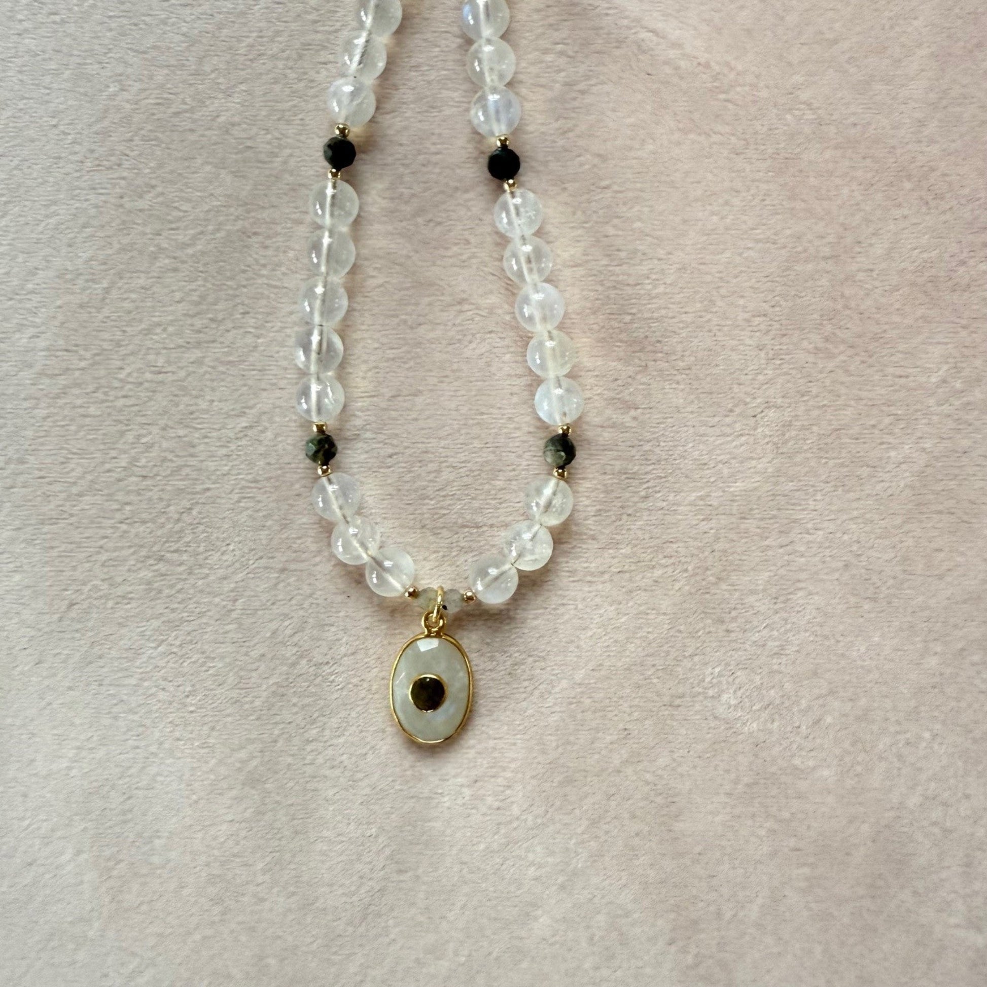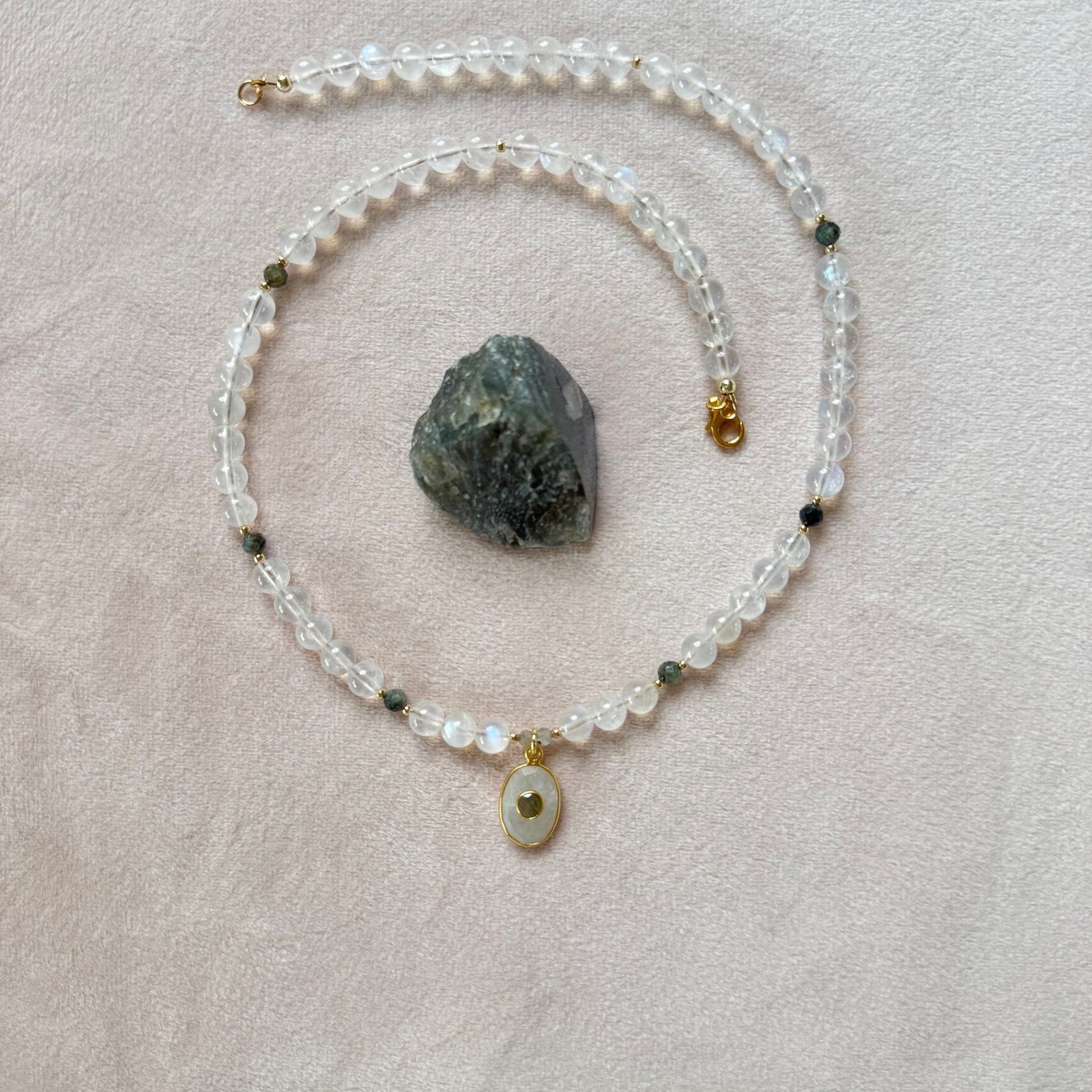 Aan de ketting hangt een bedel van regenboog maansteen met een labradoriet inlay.