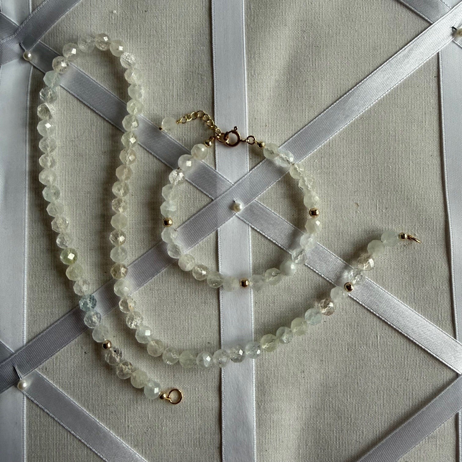 Ketting geregen van witte topaas 8 mm facetkralen. De kralen zijn wit, soms iets blauw of iets geel. Sommige kralen zijn transparant, andere zijn meer wolkachtig wit.