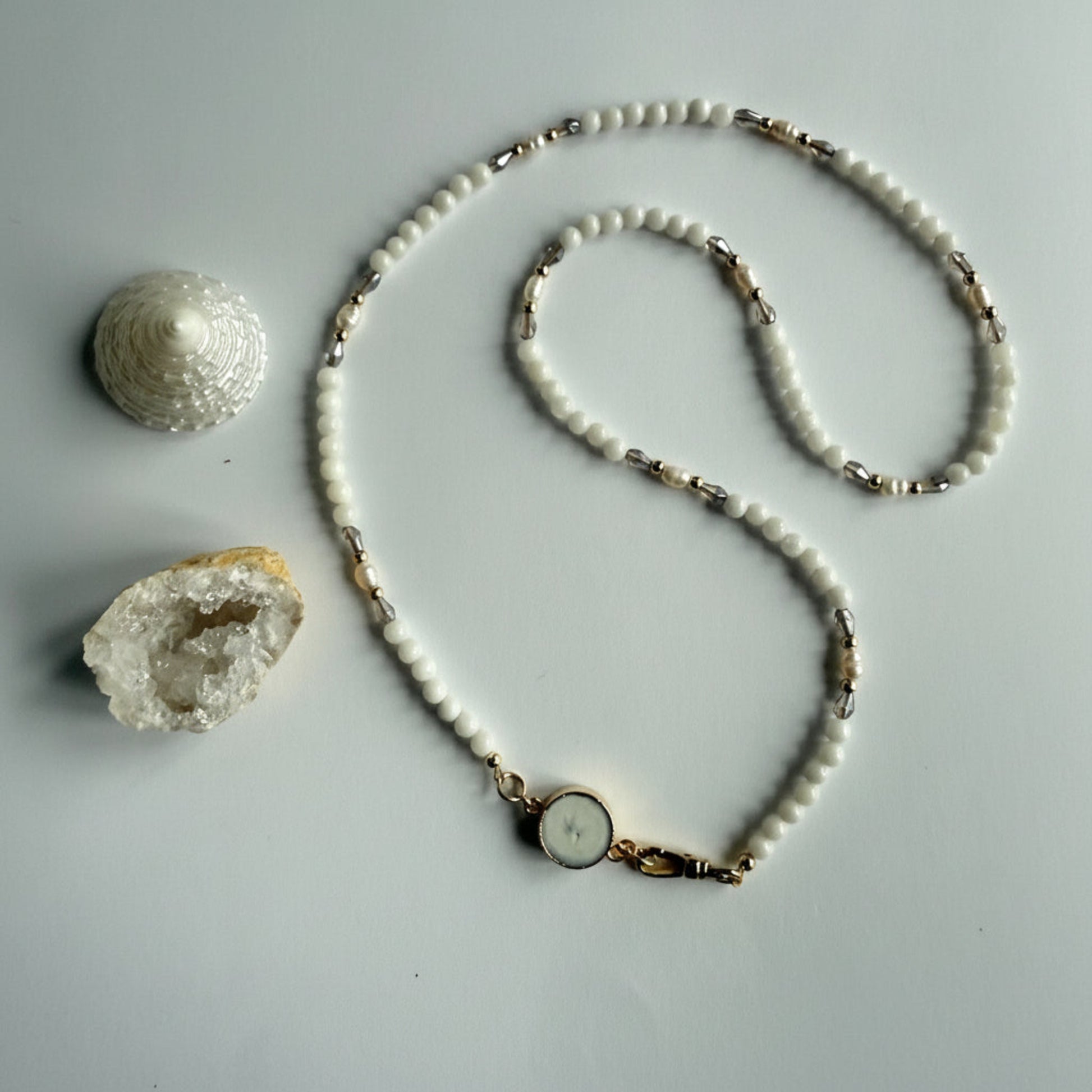 Ketting van witte jade, kristal, zoetwaterparels en een zonnekwarts bedel.