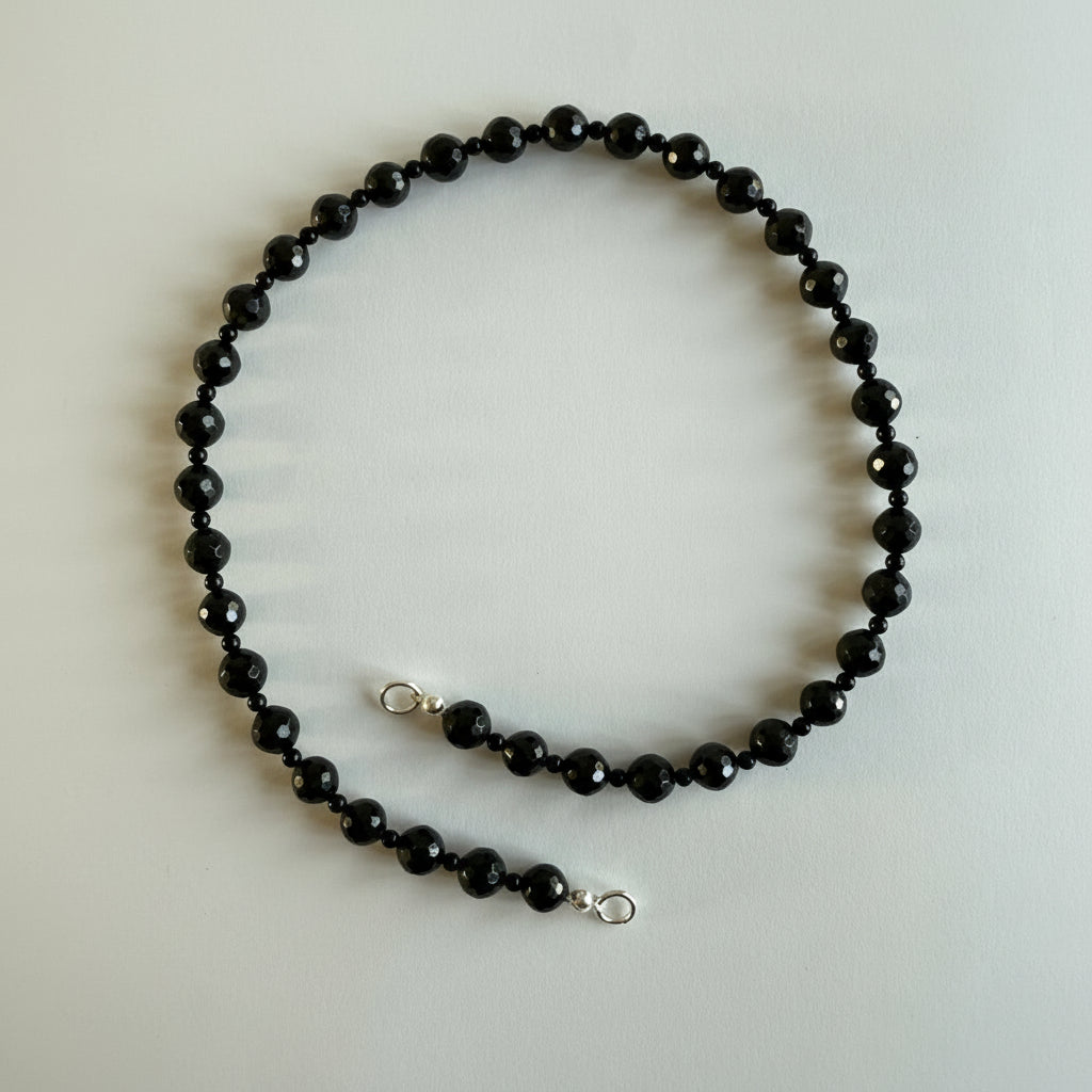 Deze ketting is geregen van 8 mm zwarte toermalijn facetkralen met daartussen kleine onyx kraaltjes.