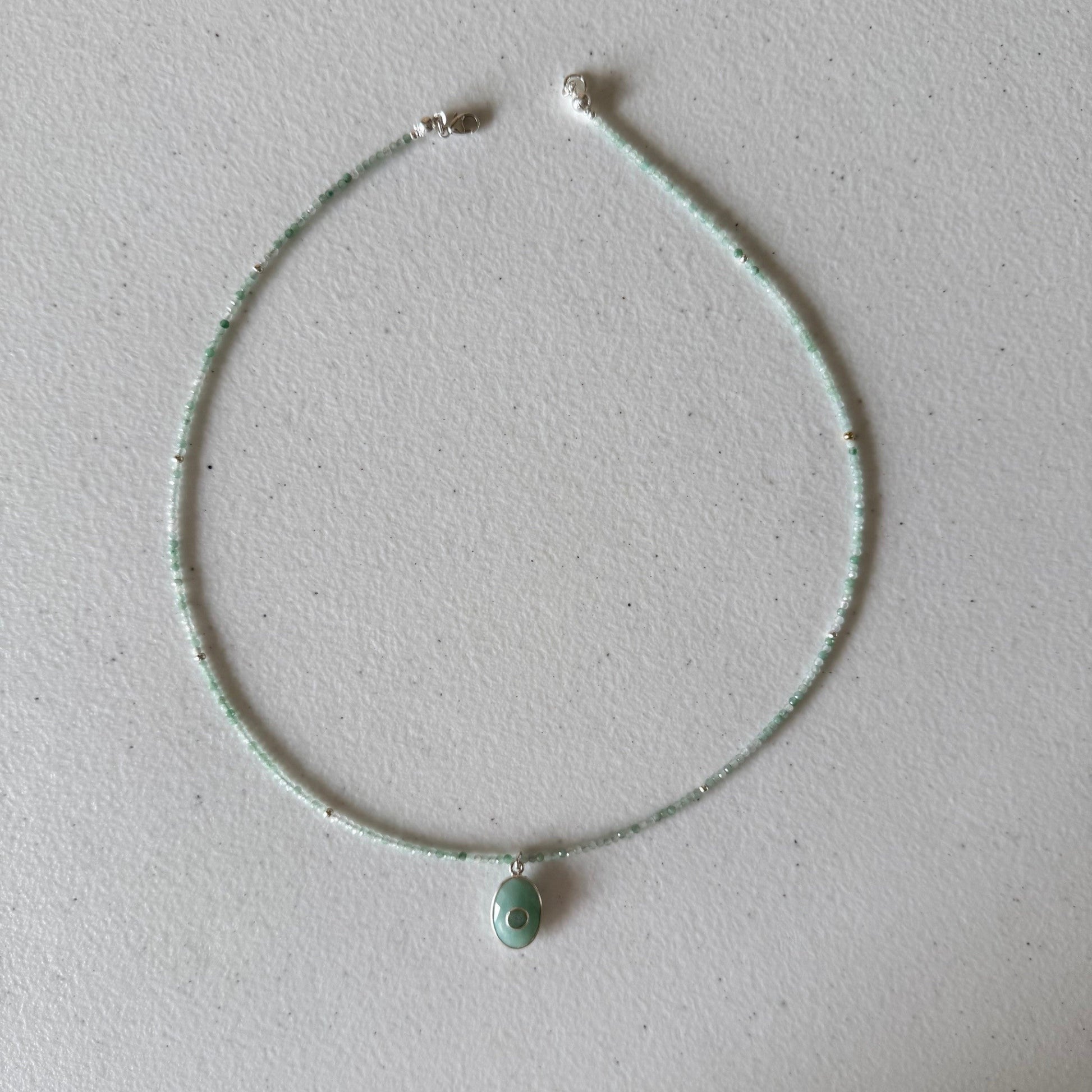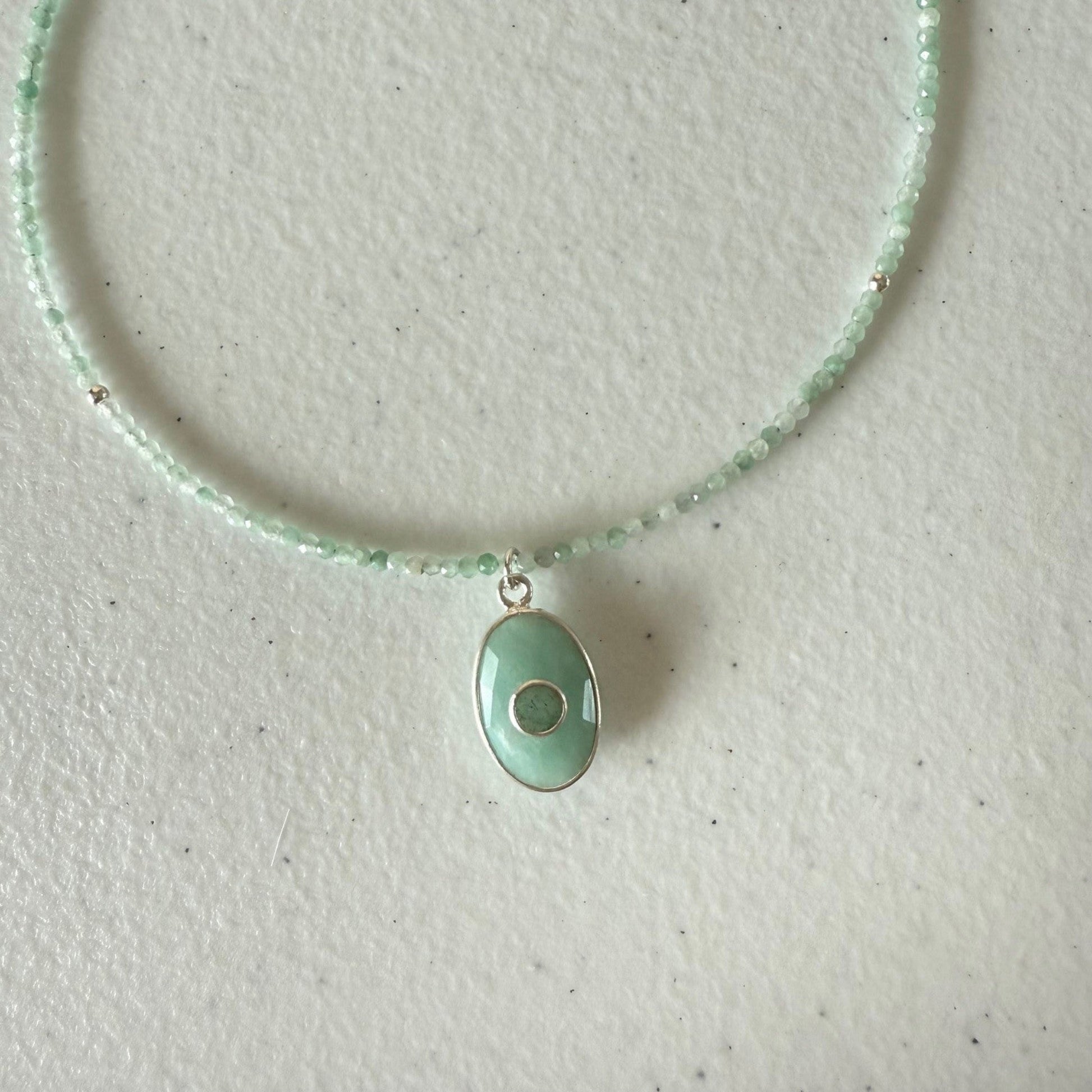 Kettinkje van jade facetkraaltjes en amazoniet hanger en zilver slotje