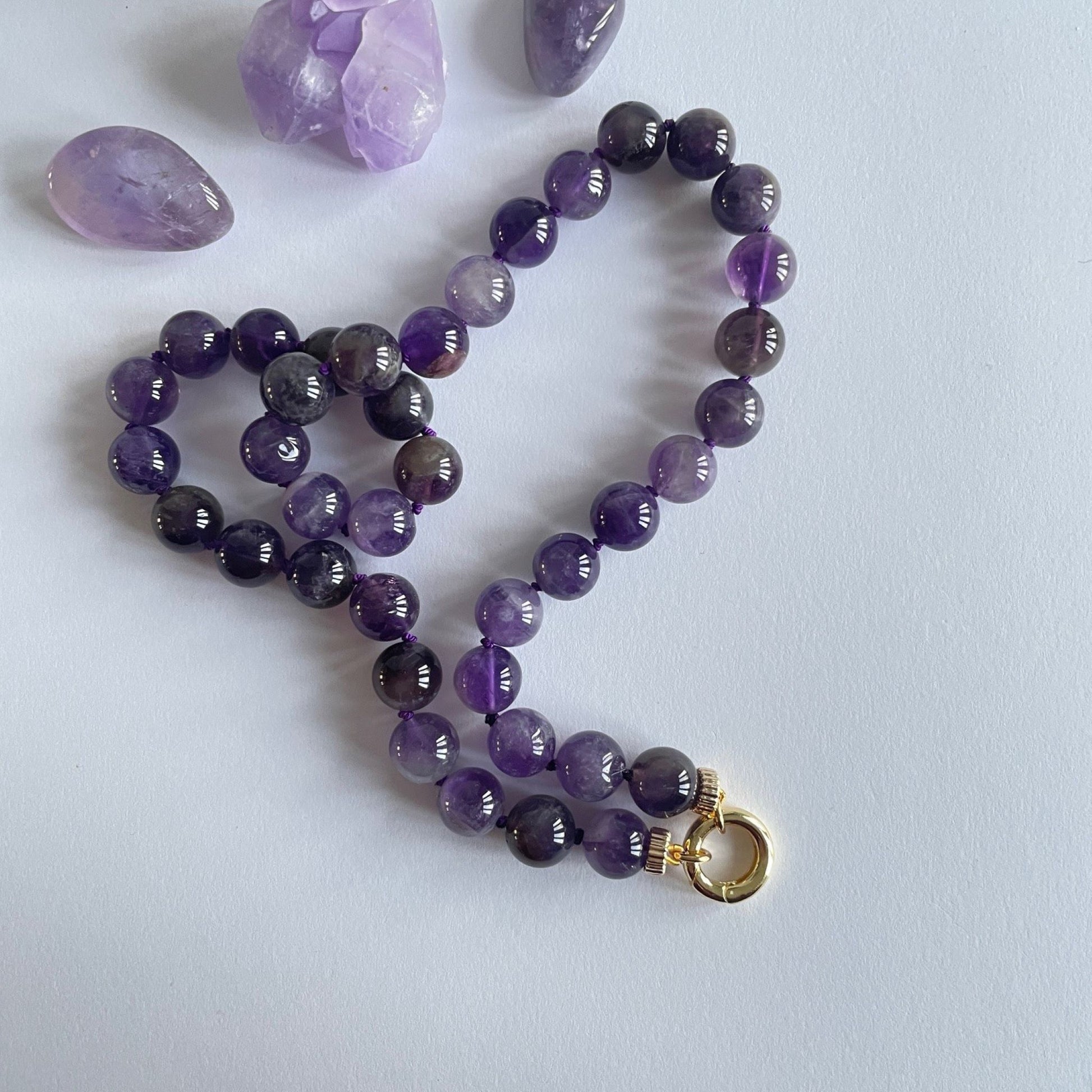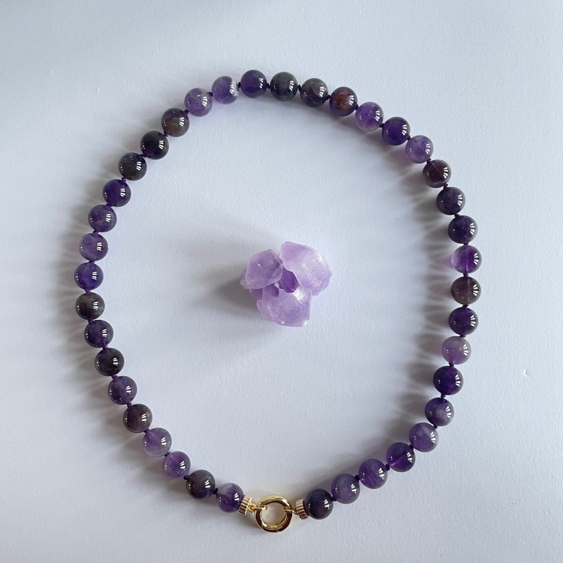 Ketting van 10 mm amethist kralen geknoopt op paarse zijde. De ketting heeft open einden Deze kunnen worden verbonden met een 14/20 gold filled sluiting.