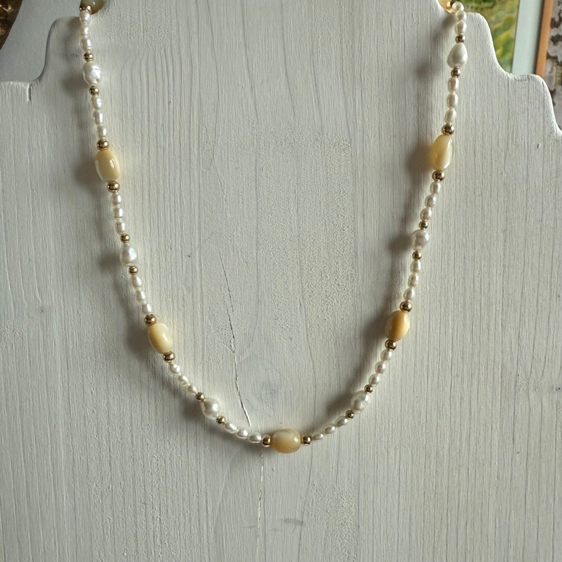 Korte ketting van goudparelmoer en zoetwaterparels met gold filled slotje