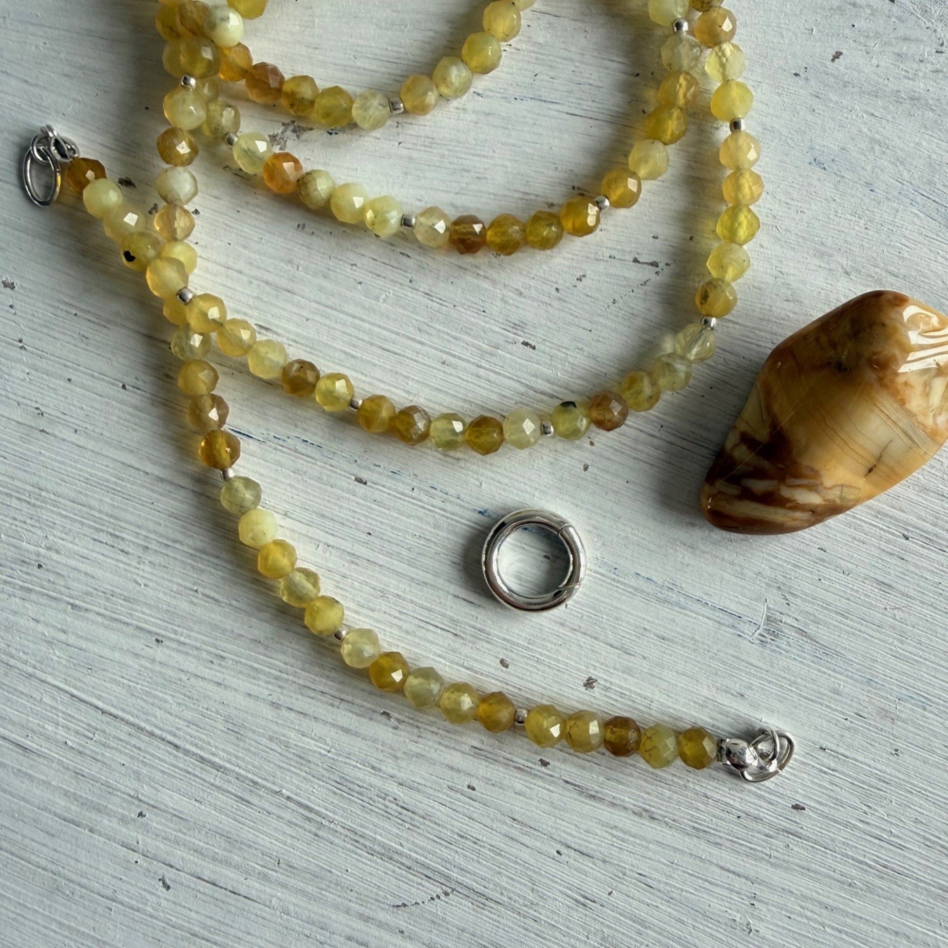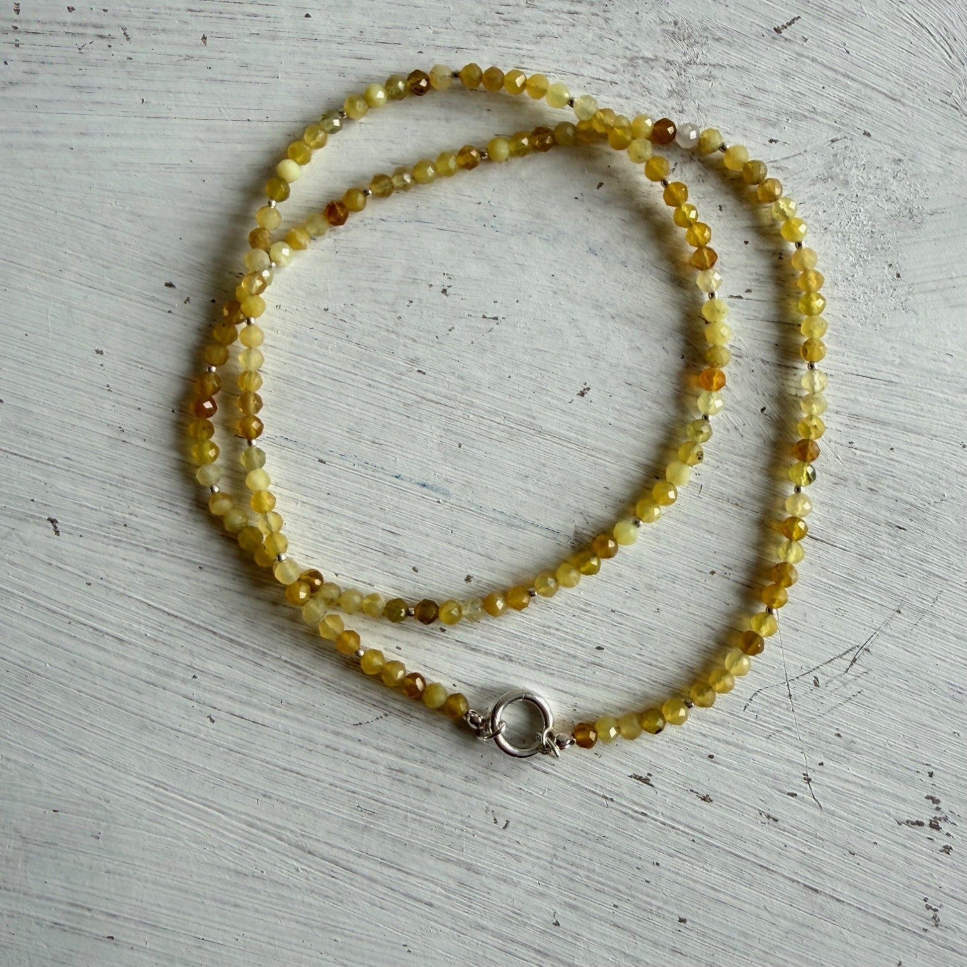 Lange ketting geregen van 4 mm facetkraaltjes gele opaal afgewisseld met zilveren kraaltjes.