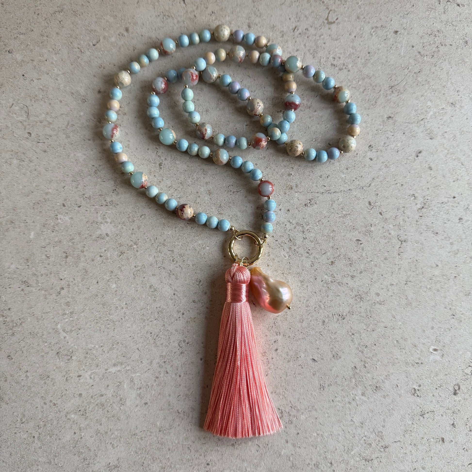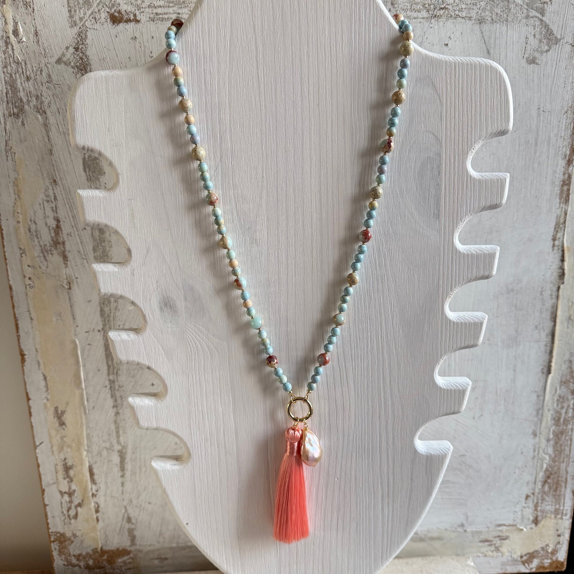 Lange ketting van jaspis en agaat met zoetwaterparel bedel - JARA