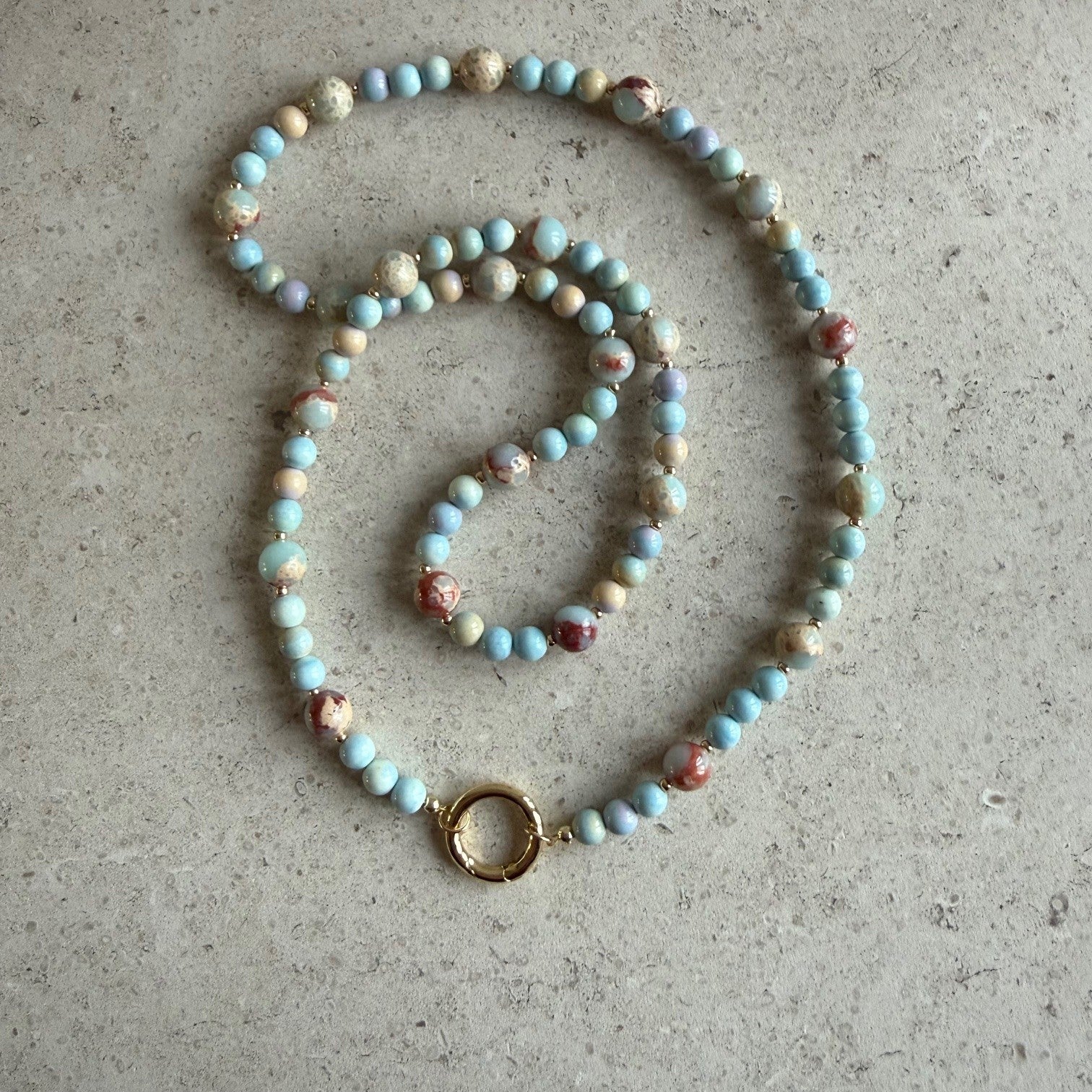 Lange ketting geregen op gecoat draad van 8 mm Keizer jaspis kralen afgewisseld met kleinere kralen van Mongoolse agaat