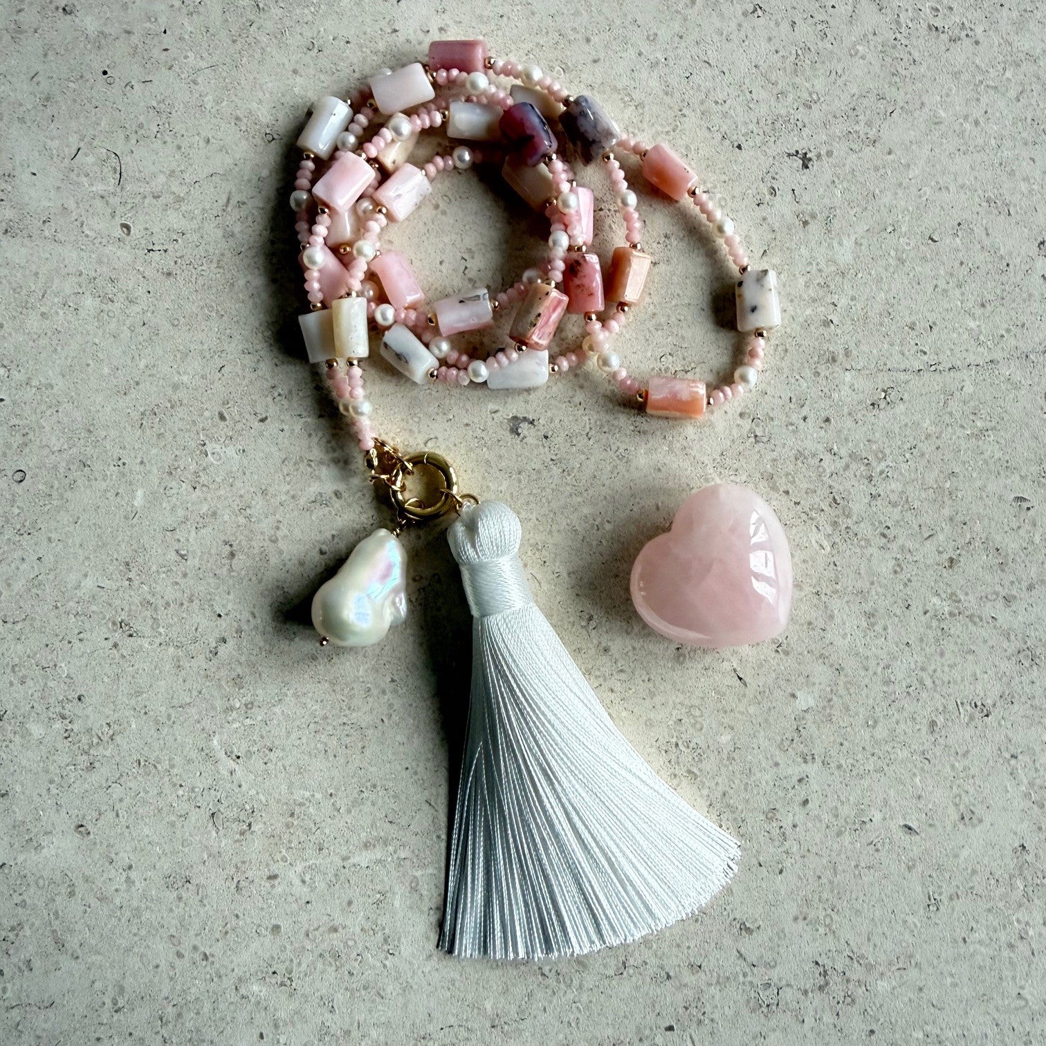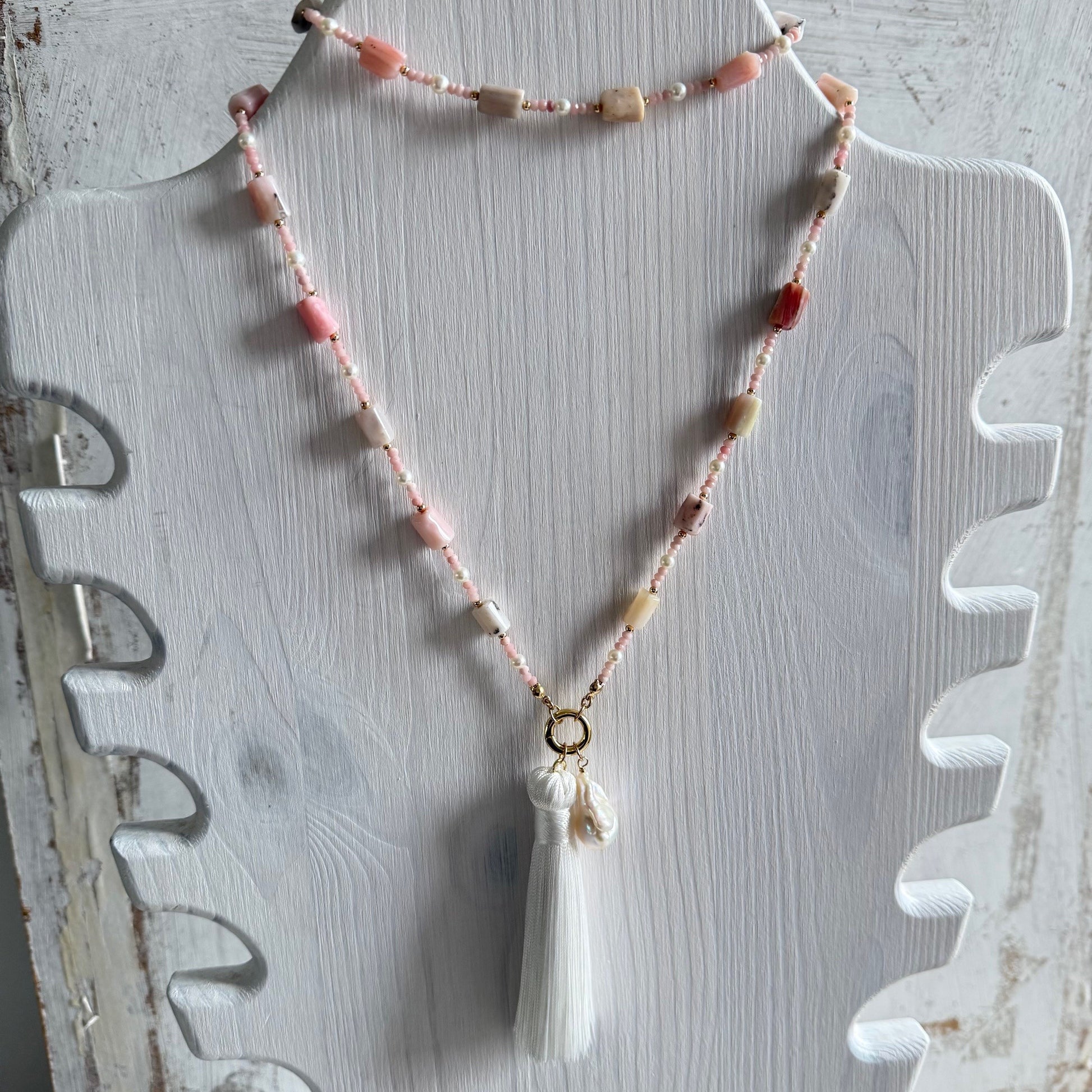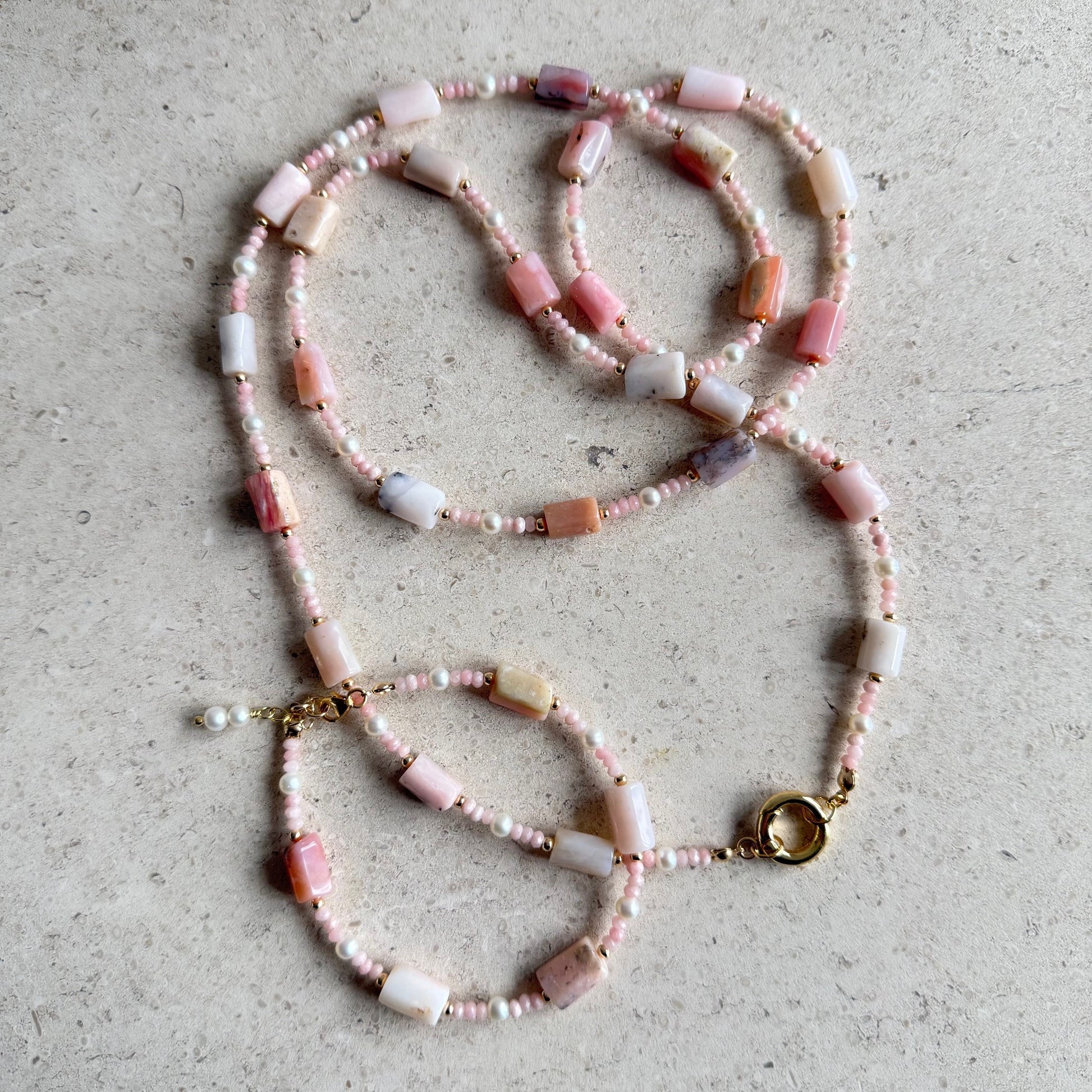 Lange ketting van roze opaal en zoetwaterpareltjes - ROZALITA