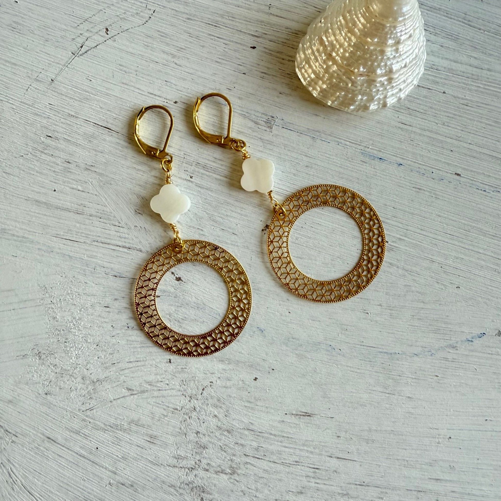 Aan sluitbare haakjes hangt een klavertje van schelp en daaronder een opengewerkte mandela.